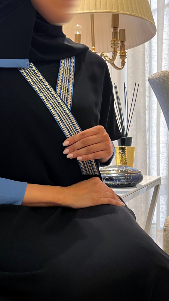 - The "DAILY SHALL" Abaya is a unique and elegant piece with a simple and attractive design. It features a loose fit that provides comfort and freedom of movement, made from crepe fabric. The collar, adorned with blue & zari colored , adds a touch of beauty and classic glamour. The long sleeves, finished with blue stretch cuffs, add a touch of perfect elegance and comfort. The combination of simplicity, elegance, and unique details in this Abaya makes it a distinctive piece suitable for various occasions and classic styles.